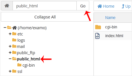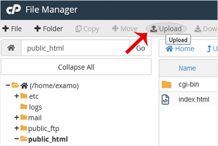 3. No Gerenciador de Arquivos cPanel, navegue até o diretório para o qual deseja enviar seus arquivos. Por exemplo, se você deseja enviar seus arquivos para o diretório HTML público, primeiro você deve ir para /public_html. No lado esquerdo, na lista de diretórios, clique duas vezes no diretório public_html . 4. Agora clique em Carregar .