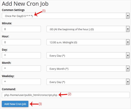 3. Em Add New Cron Job , clique no menu suspenso Common Settings e selecione uma opção apropriada, como Once Per Day ou outra opção adequada.