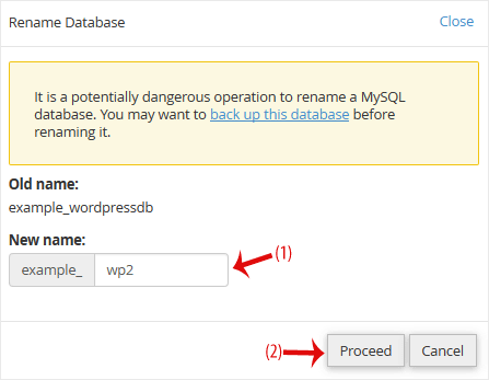 3. Em Bancos de dados atuais , você pode ver uma lista de todos os seus bancos de dados. Localize o banco de dados e clique em Renomear . 4. Altere o nome do banco de dados e clique em Continuar .