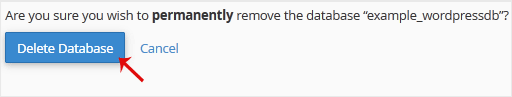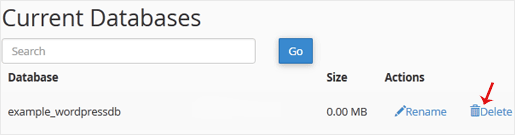 3. Em Bancos de dados atuais , você pode ver uma lista de todos os seus bancos de dados. Localize o banco de dados que deseja remover e clique em Excluir . 4. Clique em Excluir banco de dados .