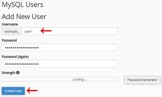 3. Em MySQL Users , no campo Username , digite o novo nome de usuário que deseja criar.