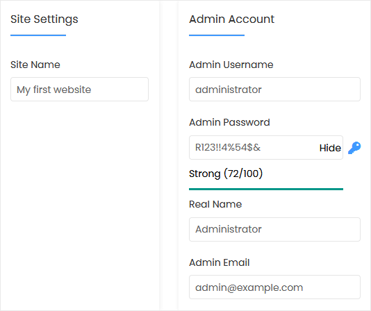 - Admin Username: Your new e107 username (for security reasons, do not use the administrator or the admin username).