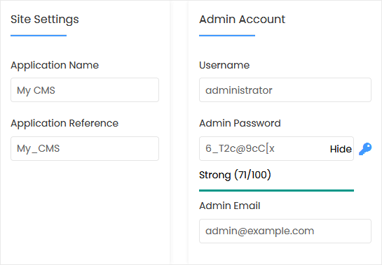 - Nome de usuário Admin: Seu novo nome de usuário PyroCMS (por motivos de segurança, não use o administrador ou o nome de usuário admin ).