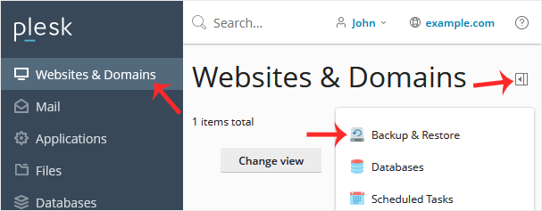 2. Vá para Sites e domínios > Clique no ícone Puxar > Escolha Backup e restauração .