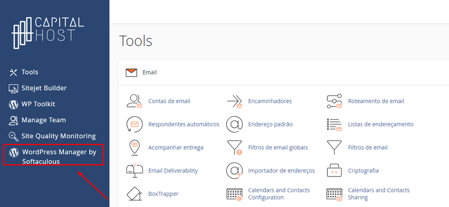 2° No menu lateral localize e clique em WordPress Manager by Softaculous.