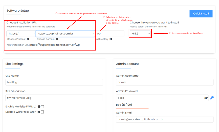 - Domínio: Selecione o domínio onde deseja instalar o WordPress. No campo "Choose Installation URL", selecione o domínio desejado.